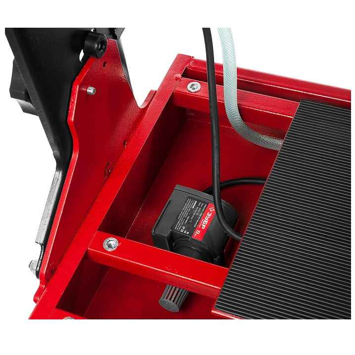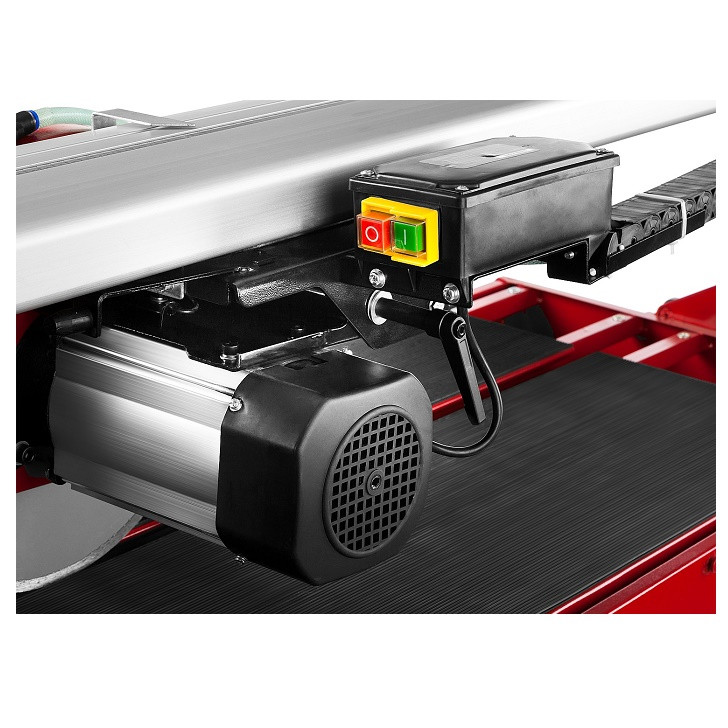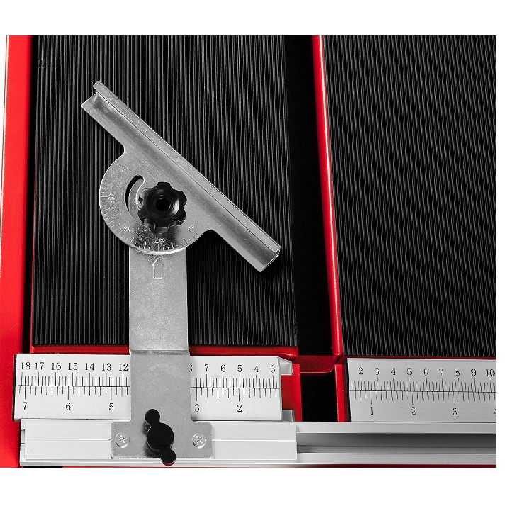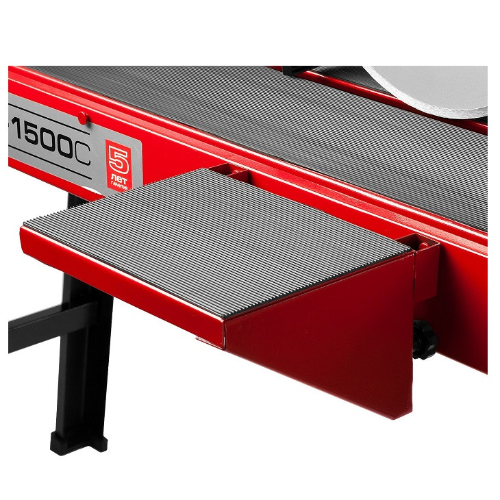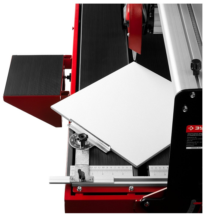 Прорезиненая поверхность стола предотвращает соскальзывание плитки во время работы. Дополнительный стол облегчает работу с габаритными деталями. Благодаря фиксирующему упору со шкалой возможна точная установка разрезаемой плитки.