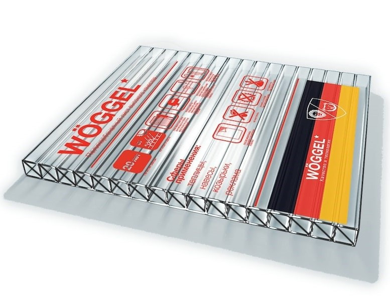 Поликарбонат сотовый усиленный Wöggel сочетает в себе отличное качество, повышенную надежность и доступную стоимость. Ключевыми факторами при производстве качественного сотового поликарбоната Wöggel являются европейское оборудование, импортное сырье и опыт европейских и отечественных специалистов. Все листы поликарбоната Wöggel имеют маркировочную защитную плёнку, которой отмечена сторона с УФ защитой. Этой стороной лист устанавливается к солнцу.