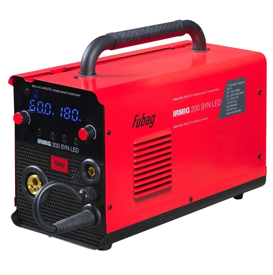 Полуавтомат сварочный Fubag IRMIG 200 SYN LED 646404 высокопроизводительный сварочный аппарат с ярким LED-дисплеем. Выбор методов сварки MMA, MIG/MAG, TIG Lift. Имеет 11 встроенных синергетических программ. Оснащен ярким, хорошо читаемым LED дисплеем с индикацией сварочного тока, напряжения и коррекции напряжения. Аппарат работает в самом распространенном диапазоне сварочного тока 15-200 А с проволокой диаметром от 0,6 до 1,0 мм, катушкой весом 5 кг и диаметром 200 мм. Передняя панель оснащена регуляторами силы тока и скорости подачи проволоки, что позволяет быстро и просто выбирать режимы и оптимальные параметры сварки. Сварочный полуавтомат IRMIG 200 SYN LED оснащен евроразъемом (EURO) для быстрого и безопасного подключения сварочной горелки.