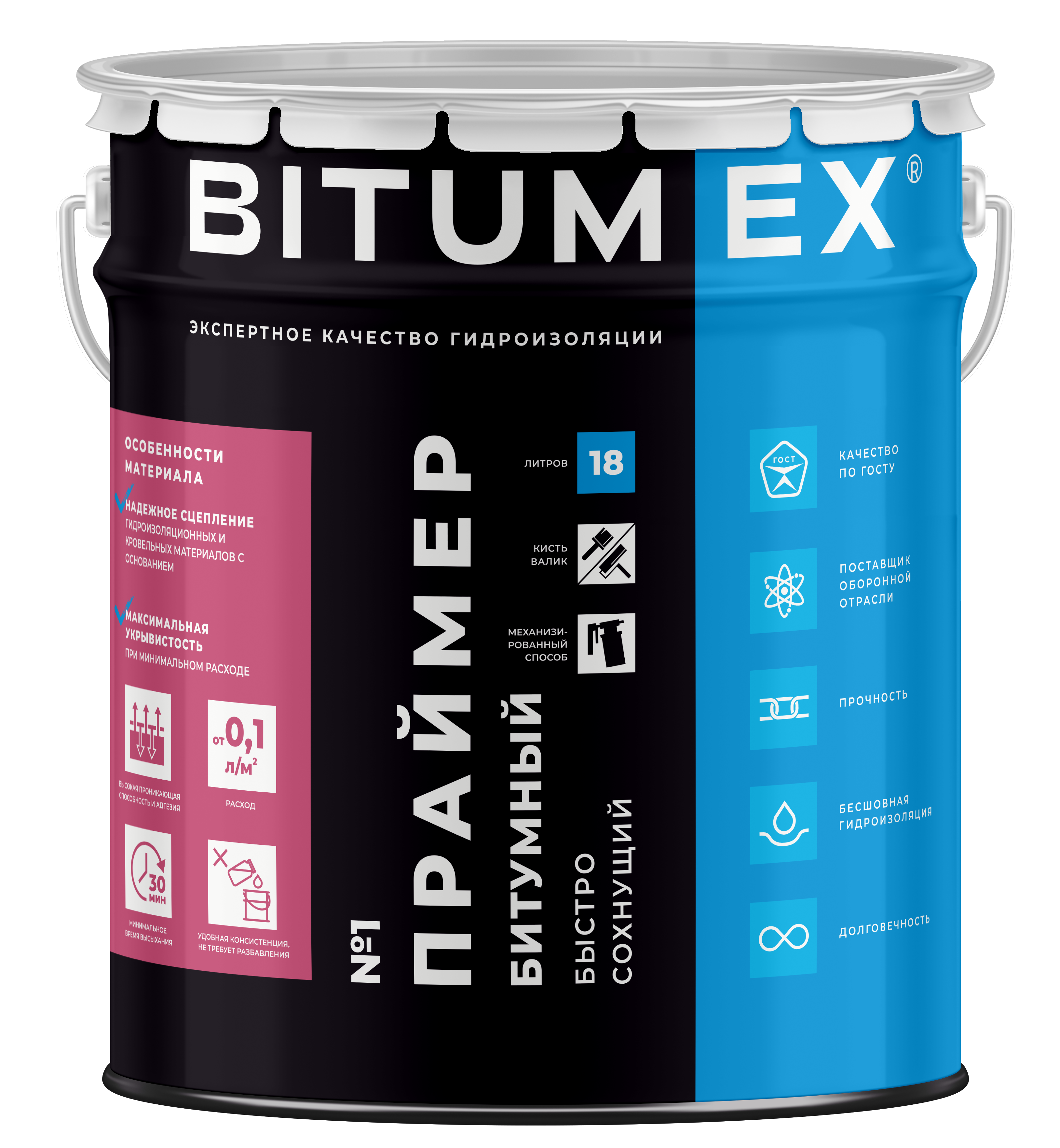Bitumex праймер битумный №1 быстросохнущий является готовым к применению материалом на основе высококачественного строительного битума и высоколетучего органического растворителя. Bitumex праймер битумный №1 быстросохнущий прошел экспертизу Федеральной службы по надзору в сфере защиты прав потребителей и благополучия человека. Праймер произведен согласно ТУ 5775-001-60787762-2009 с изм.1. Сертификат соответствия № РОСС RU.HB61.Н23104.