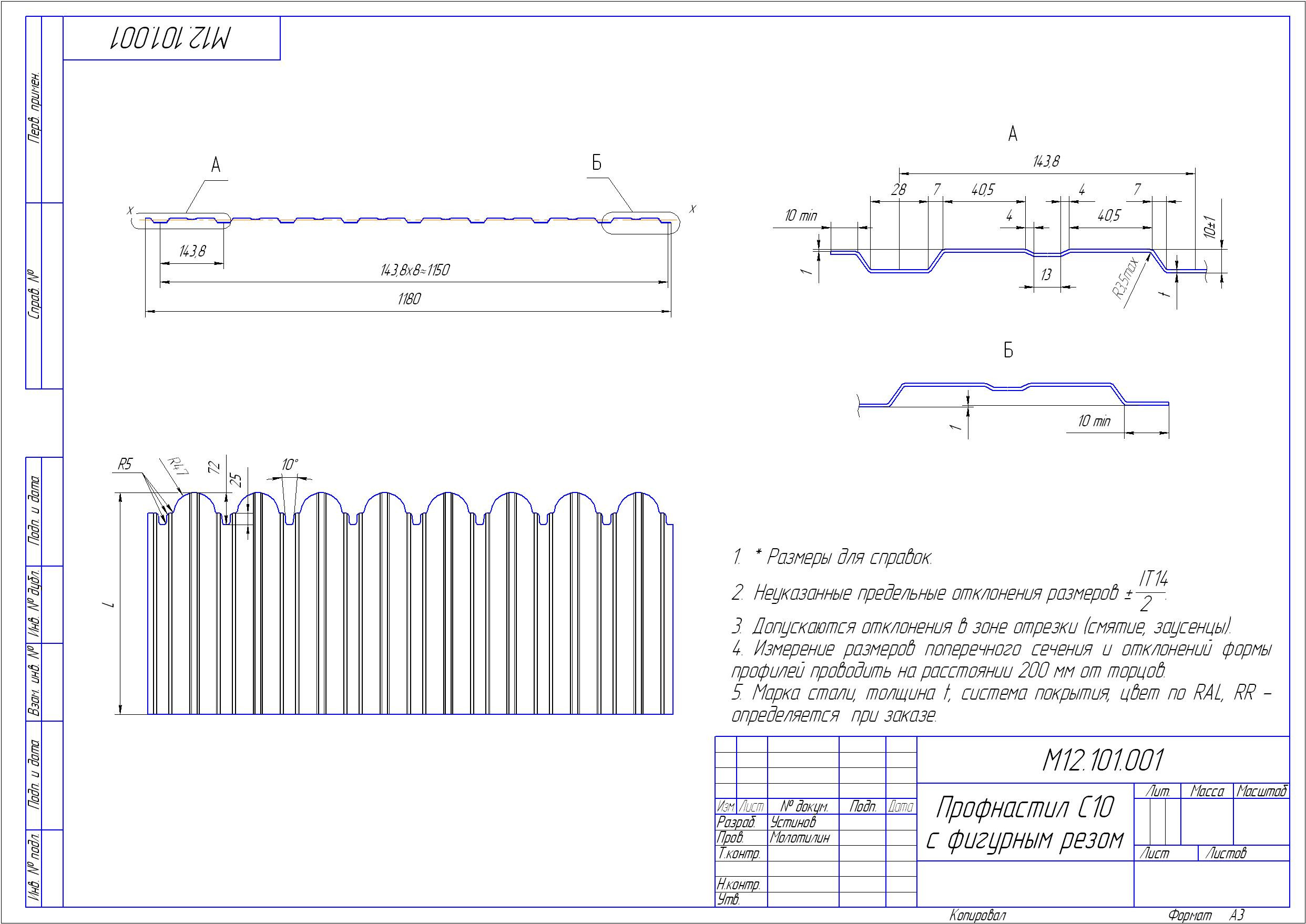 Технические характеристики фигурного профлиста С10 для забора не отличаются от стандартных изделий. Он также изготавливается из тонколистовой стали с полимерным покрытием. Вы можете заказать фигурный профнастил длиной от 1,5 до 3,0 метров. Чтобы обеспечить необходимую прочность и жесткость лист профилируют на глубину гофры 10 мм. Это делает его низковолнистым, что способствет широкому применению для конструкций высокой сложности. Гофр на таком профиле имеет трапециевидную форму. Волны профнастила для повышения степени жесткости кровли имеют еще дополнительные продольные ребра.