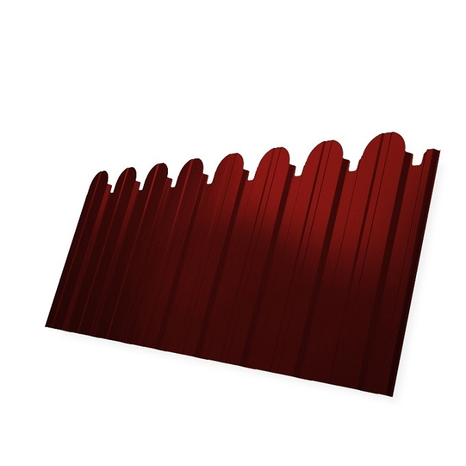 Технические характеристики фигурного профлиста С10 для забора не отличаются от стандартных изделий. Он также изготавливается из тонколистовой стали с полимерным покрытием. Вы можете заказать фигурный профнастил длиной от 1,5 до 3,0 метров. Чтобы обеспечить необходимую прочность и жесткость лист профилируют на глубину гофры 10 мм. Это делает его низковолнистым, что способствет широкому применению для конструкций высокой сложности. Гофр на таком профиле имеет трапециевидную форму. Волны профнастила для повышения степени жесткости кровли имеют еще дополнительные продольные ребра.