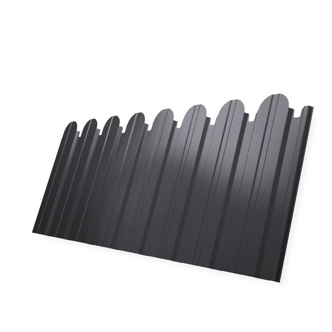 Технические характеристики фигурного профлиста С10 для забора не отличаются от стандартных изделий. Он также изготавливается из тонколистовой стали с полимерным покрытием. Вы можете заказать фигурный профнастил длиной от 1,5 до 3,0 метров. Чтобы обеспечить необходимую прочность и жесткость лист профилируют на глубину гофры 10 мм. Это делает его низковолнистым, что способствет широкому применению для конструкций высокой сложности. Гофр на таком профиле имеет трапециевидную форму. Волны профнастила для повышения степени жесткости кровли имеют еще дополнительные продольные ребра.