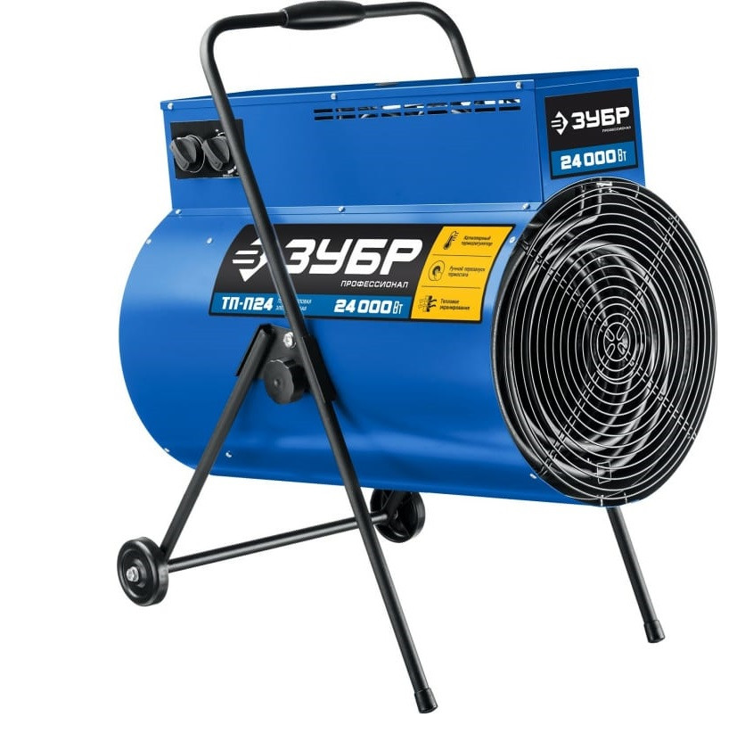 Пушка тепловая электрическая Зубр Профессионал ТП-П24 24 кВт с питанием от трехфазной электрической сети. Эффективен для быстрого и направленного обогрева складских и производственных помещений, ангаров и мастерских, благодаря большой площади нагревательных элементов и мощным двигателем вентилятора. Надёжная доработанная конструкция обеспечивает защиту как пользователя, так и тепловой пушки в случае возникновения нештатных ситуаций. Применяется для генерации горячего воздуха, который может быть использован для обогрева, сушки промышленных, складских, вспомогательных помещений и т. д.
