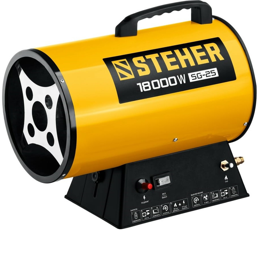 Пушка тепловая газовая Steher SG-25 18 кВт предназначена для генерации горячего воздуха, который может быть использован для обогрева, сушки промышленных, складских, вспомогательных помещений и т. д. Устройство имеет компактный корпус, контроль наличия пламени, биметаллический термопредохранитель и двойное теплоэкранирование. Имеется пьезоподжиг, армированный газовый шланг с редуктором давления в комплекте. Тип газа - пропан/пропан-бутан/бутан.