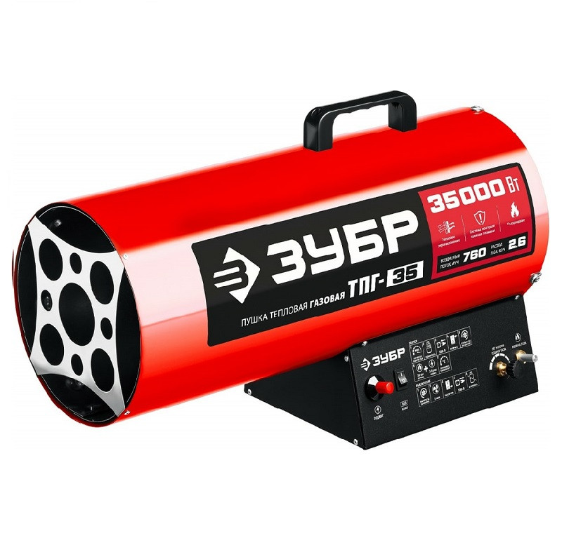 Пушка тепловая газовая Зубр ТПГ-35 35 кВт высокоэффективный газовый обогреватель, работающий на наиболее распространенном виде топлива. Оптимально подходит для использования для прогрева автосервисов, складов, производственных помещений строительных площадок и ангаров, а так же для монтажа натяжных потолков. Надежный поджиг дуги и эффективное горение гарантируют безотказную подачу тепла в любых условиях эксплуатации. Применяется для генерации горячего воздуха, который может быть использован для обогрева, сушки промышленных, складских, вспомогательных помещений и т. д.