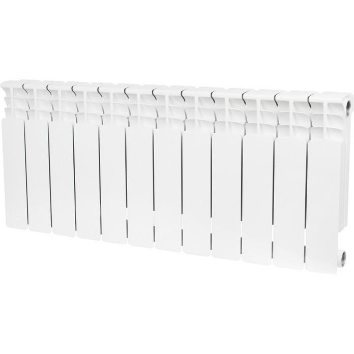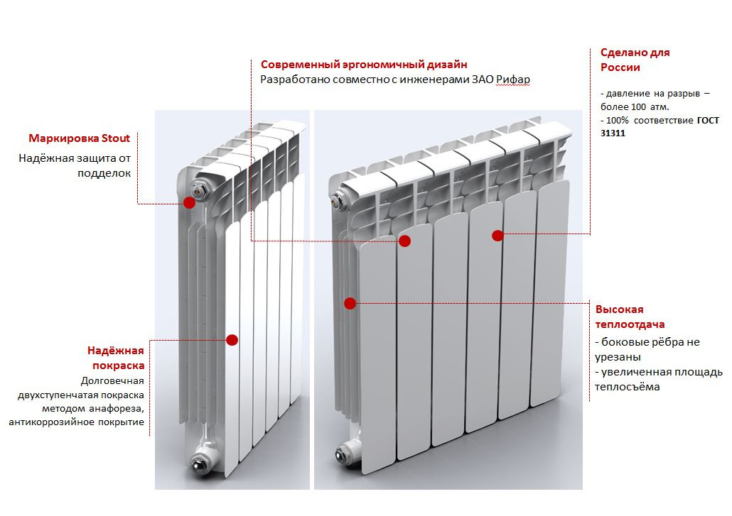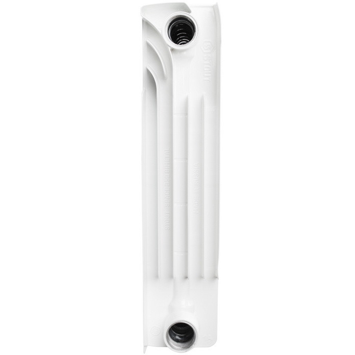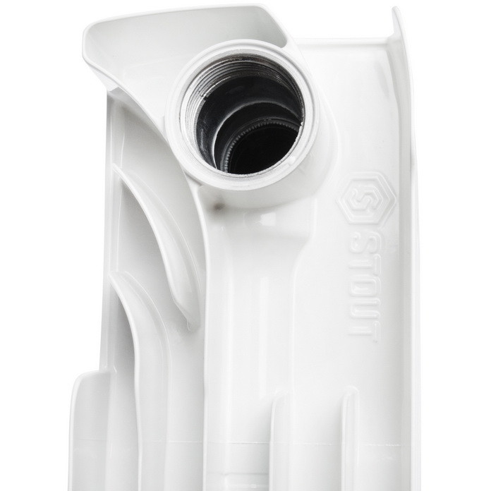 Биметаллические секционные радиаторы Stout Space предназначены для применения в системах водяного отопления зданий различного назначения. Радиаторы Stout Space собираются из отдельных секций, которые изготавливаются из качественного алюминиевого сплава методом литья под давлением. Каждая секция представляет собой единый монолит из двух коллекторов и связывающего их оребрения, внутри которого проходит вертикальный канал из стальной трубы внутренним диаметром 12,8 мм. Такая конструкция в сочетании с особой формой оребрения обеспечивают высокие теплотехнические показатели радиатора, низкое гидравлическое сопротивление и значительную прочность. В отверстиях коллекторов выполнена трубная резьба размером 1" (с одной стороны правая, а с другой – левая). Резьба служит для соединения секций между собой в радиаторы различной длины с помощью стальных резьбовых ниппелей. Геометрия ниппельных соединений и параметры силиконовых прокладок гарантируют надежную герметичность собранного радиатора. Наружная поверхность секции радиатора окрашена порошковой эмалью (двухступенчатая технология окраски) белого цвета (RAL 9010).