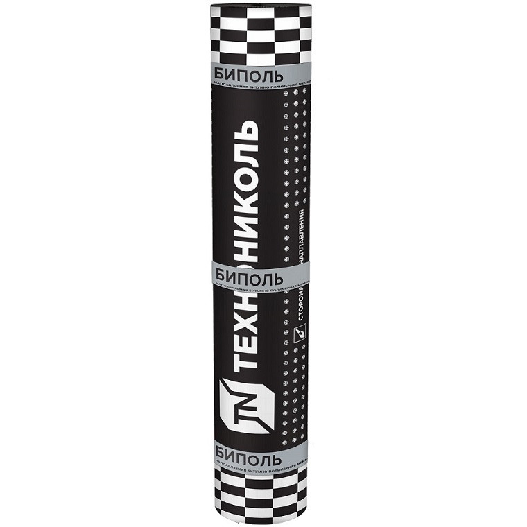Технониколь Биполь ТКП – наплавляемый рулонный гидроизоляционный материал, состоящий из прочной основы и битумного состава. Его получают путем двустороннего нанесения на стекловолокнистую основу битумно-полимерного вяжущего, состоящего из битума, СБС (стирол-бутадиен-стирол) полимерного модификатора и минерального наполнителя (тальк, доломит и др.), с последующим нанесением на обе стороны полотна защитных слоев. В качестве защитных слоев используют крупнозернистую посыпку и полимерную пленку.
