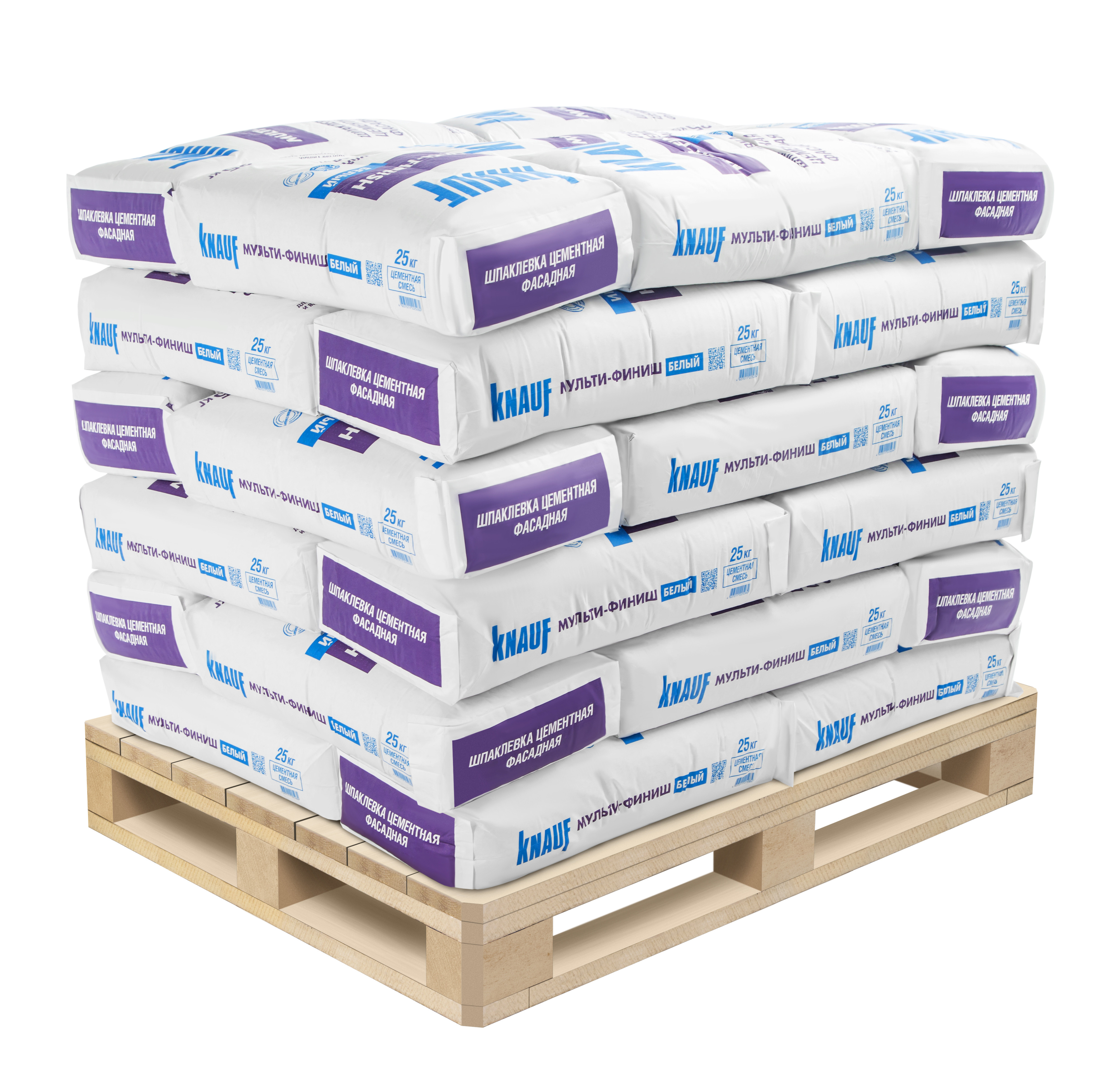 Шпаклёвка цементная фасадная Knauf Мульти-финиш белый 25 кг - сухая смесь на основе белого цемента с заполнителем, полимерными добавками, и армирующим волокном. Применяется для наружных и внутренних работ. Шпатлевка предназначена для выравнивания поверхностей бетона и цементных штукатурок, например, Knauf Грюнбанд, Кнауф Унтерпутц и Knauf-Зокельпутц на фасадах зданий и в помещениях с повышенной влажностью, для ремонта, заделки трещин, заполнения отверстий.