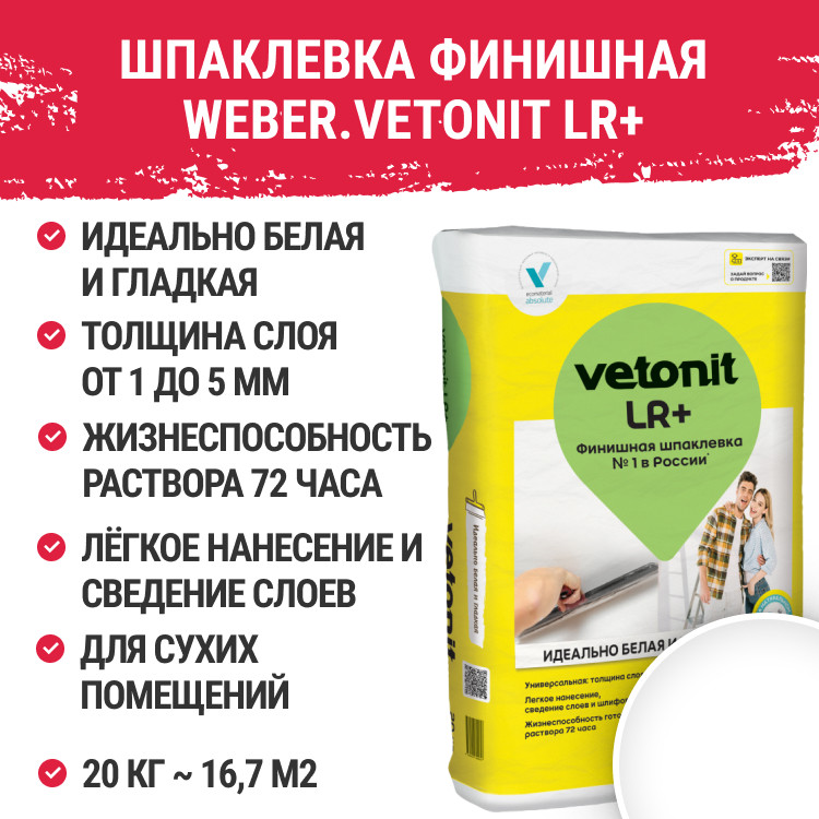 Шпатлевка полимерная Weber.Vetonit LR+ предназначена для финишного выравнивания стен и потолков в сухих помещениях перед оклейкой обоями и покраской.