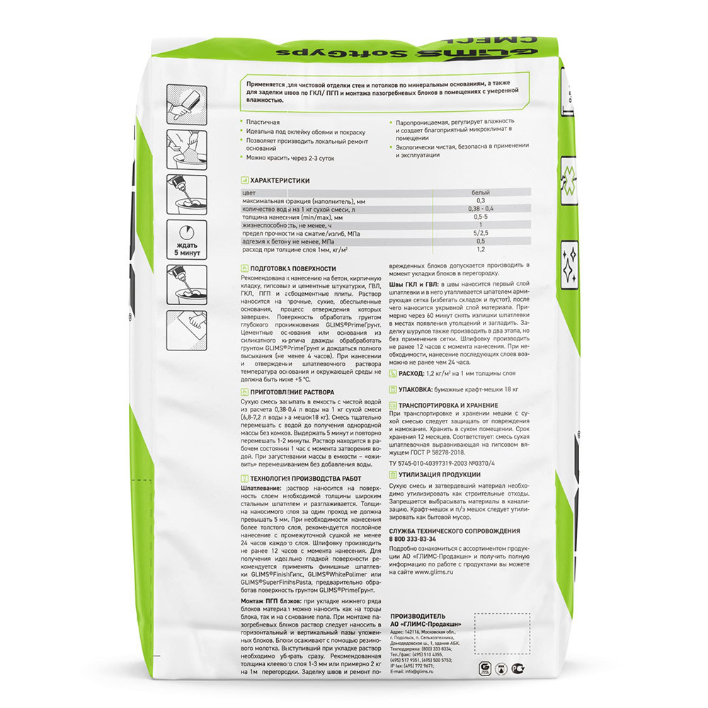 Шпатлевка Glims SoftGyps гипсовая белая для финишного выравнивания стен и потолков в сухих и умеренно влажных помещениях под покраску, декоративные покрытия и оклейку обоями. Используется для внутренних работ. Наносится на основания из бетона, кирпичную кладку, гипсовые и цементные штукатурки, ГКЛ, ГКЛВ, ГВЛ и асбоцементные плиты.
