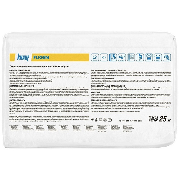 Шпатлевка Фуген представляет собой сухую смесь на гипсовой основе. В ее состав входят модифицирующие полимерные добавки, которые придают шпатлевкам определенные свойства. Используется для заделки швов между листами гипсокартона. Также могут быть использованы для заделки мелких неровностей в бетонных основаниях. Еще одним вариантом использования Кнауф Фуген является склеивание и монтаж гипсовых изделий.