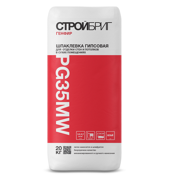 Шпатлевка гипсовая Стройбриг Генфир PG 35 MW предназначена для выравнивания стен и потолков, для заделки швов ГКЛ и ГВЛ. Рекомендуется под последующее нанесение декоративных покрытий: красок, обоев, и других.