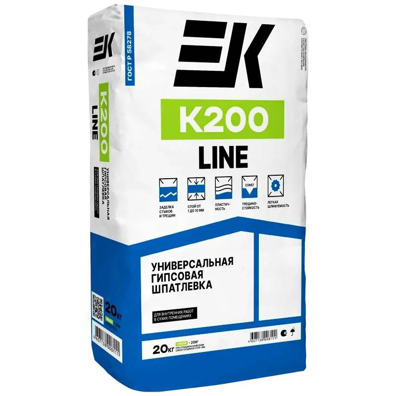 Шпатлевка гипсовая универсальная ЕК Line К-200 20 кг - предназначена для выравнивания вертикальных и горизонтальных бетонных, цементных, цементно-известковых, гипсовых, ПГП (за исключением гидрофобных ПГП) и гипсокартонных поверхностей в сухих помещениях под окраску и оклейку обоями, а также заделки стыков с помощью армирующей ленты и неровностей слоем до 10 мм.