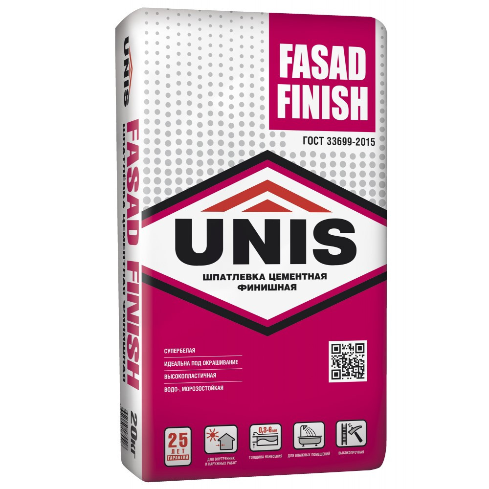 Шпатлевка цементная Unis Фасад белая предназначена для финишного выравнивания поверхностей фасадов зданий, заделки выбоин, трещин, раковин слоем до 6 мм под последующую отделку декоративными покрытиями. Рекомендуется для высококачественного окрашивания.