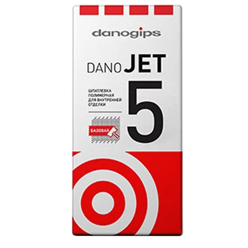 Danogips Dano Jet 5 - сухая полимерная шпатлевка, предназначенная для выравнивания стен и потолков в сухих помещениях. Подходит для любых минеральных оснований и обладает высокой эластичностью и низкой усадкой на средних и толстых слоях до 6 мм. Не выкрашивается при ошкуривании и не размывается обойным клеем.