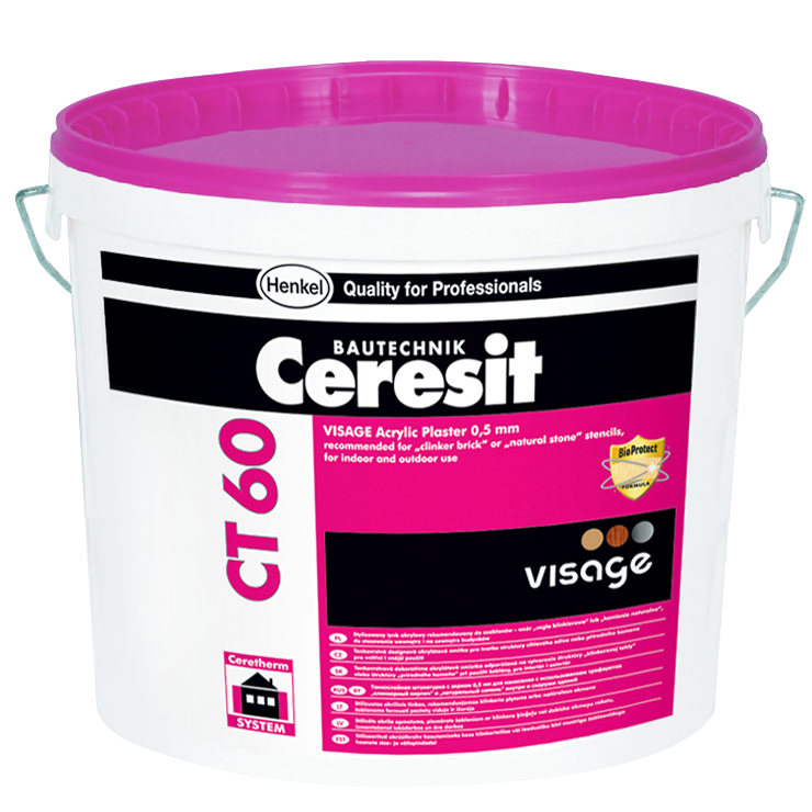Декоративная акриловая штукатурка Ceresit CT 60 Visage предназначена для изготовления тонкослойных декоративных покрытий на таких основаниях как бетон, цементные и гипсовые штукатурки, гипсокартон, древесностружечные плиты и т.п., а также на базовом штукатурном слое в составе систем фасадных теплоизоляционных композиционных (СФТК) с теплоизоляционным слоем из пенополистирольных плит (Ceresit EPS).