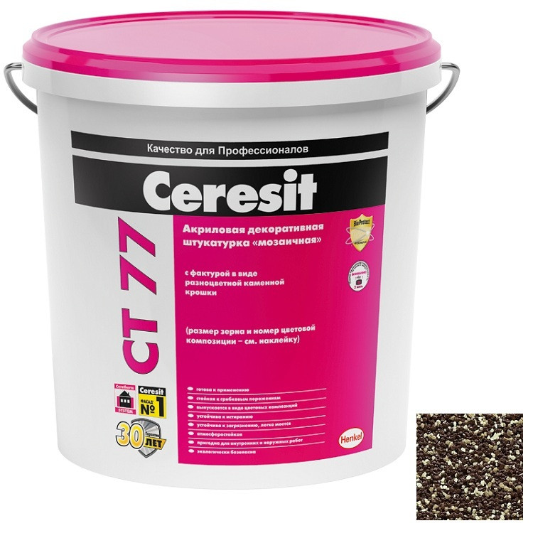 Декоративная штукатурка Ceresit CT 77 Мозаичная предназначена для изготовления тонкослойных декоративных покрытий с «мозаичной» фактурой на бетоне, цементных и гипсовых штукатурках, гипсокартоне, древесностружечных плитах и т.д. внутри и снаружи зданий. Рекомендована для систем фасадных теплоизоляционных композиционных (СФТК) с теплоизоляционным слоем из пенополистирольных плит (Ceresit EPS).