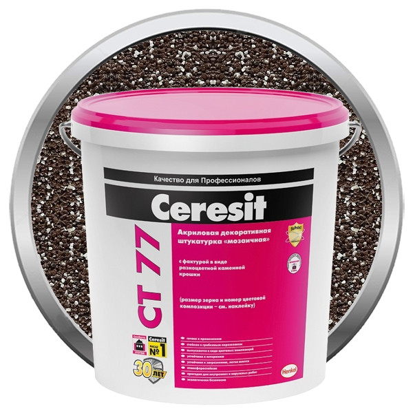 Декоративная штукатурка Ceresit CT 77 Мозаичная предназначена для изготовления тонкослойных декоративных покрытий с «мозаичной» фактурой на бетоне, цементных и гипсовых штукатурках, гипсокартоне, древесностружечных плитах и т.д. внутри и снаружи зданий. Рекомендована для систем фасадных теплоизоляционных композиционных (СФТК) с теплоизоляционным слоем из пенополистирольных плит (Ceresit EPS).