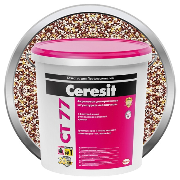 Декоративная штукатурка Ceresit CT 77 Мозаичная предназначена для изготовления тонкослойных декоративных покрытий с «мозаичной» фактурой на бетоне, цементных и гипсовых штукатурках, гипсокартоне, древесностружечных плитах и т.д. внутри и снаружи зданий. Рекомендована для систем фасадных теплоизоляционных композиционных (СФТК) с теплоизоляционным слоем из пенополистирольных плит (Ceresit EPS).
