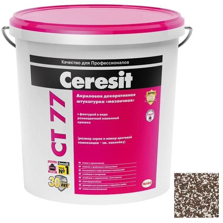 Декоративная штукатурка Ceresit CT 77 Мозаичная предназначена для изготовления тонкослойных декоративных покрытий с «мозаичной» фактурой на бетоне, цементных и гипсовых штукатурках, гипсокартоне, древесностружечных плитах и т.д. внутри и снаружи зданий. Рекомендована для систем фасадных теплоизоляционных композиционных (СФТК) с теплоизоляционным слоем из пенополистирольных плит (Ceresit EPS).