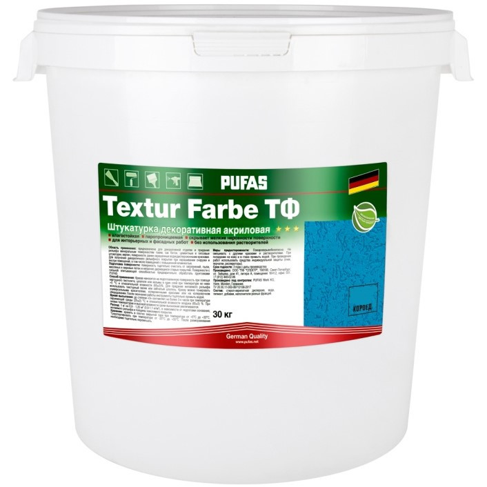 Штукатурка декоративная акриловая Pufas Textur Farbe ТФ шагрень шуба морозостойкая 1 мм 30 кг - предназначена для декоративной отделки и придания рельефа минеральным поверхностям таким как: бетон, цементные и гипсовые штукатурки, кирпич, поверхности, ранее окрашенные водно-дисперсионными красками. Применяется для наружных работ, в том числе для фасадов, а также внутри сухих помещений и помещений с повышенной влажностью (коридоры, лифтовые холлы, лестничные марши, места общего пользования).