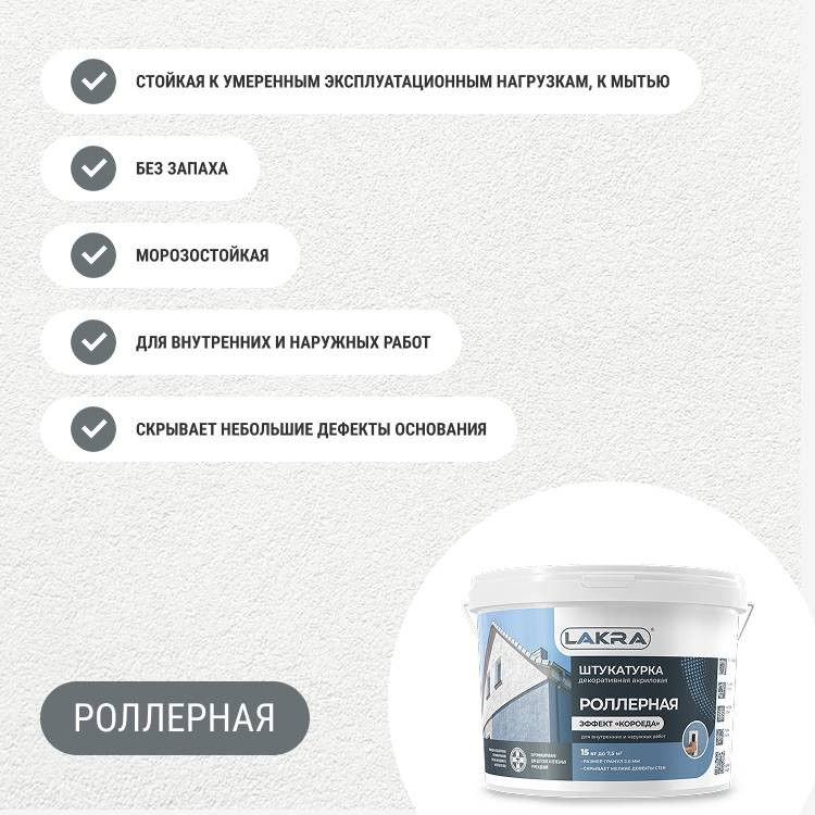 Штукатурка декоративная роллерная Лакра с эффектом короеда 15 кг - Готовая к применению декоративная штукатурка повышенной белизны на основе водной акриловой дисперсии с характерной структурой в виде канавок и желобков. Образует на поверхности рельеф, напоминающий следы короеда на стволе дерева. Создает прочное влагостойкое, паропроницаемое покрытие, стойкое к атмосферным воздействиям и умеренным эксплуатационным нагрузкам. Обладает отличной адгезией к поверхностям из бетона, камня, гипса, цемента, кирпича, ДСП, ДВП. Не содержит растворителей, без запаха. Размер гранул ~ 2 мм. Допускает мытье окрашенной поверхности.