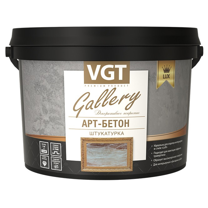Штукатурка декоративная VGT Арт-бетон 4,8 л/8 кг образует на поверхности характерную заглаженную фактуру с вкраплениями окатанной фракции (0,2-0,5 мм) доломита тёмного цвета, что даёт возможность имитировать различные текстуры бетона или камня. Разнообразие способов нанесения позволяет применять материал в отделке различных стилей: loft, high-tech, Арт-деко и др. Обладает высокими эксплуатационными характеристиками, поэтому материал можно применять как для интерьеров, так и для фасадной отделки.