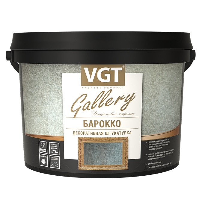 Штукатурка декоративная VGT Барокко 0,8 л/1 кг декоративная штукатурка с перламутровыми частицами различной величины, целлюлозным волокном и микрошариками для внутренних работ по новым и старым минеральным поверхностям. Благодаря своей структуре материал легко наносить, что позволяет создавать на поверхности изящную фактуру (до 1 мм) и скрывать мелкие неровности стен. Подходит для создания разнообразных эффектов (шёлка, металлизации и др.) в интерьерах различных стилей от роскошного "Барокко" до современного Hi-Tech. Лёгкость и простота нанесения штукатурки дают возможность воплотить в жизнь самые необычные идеи.