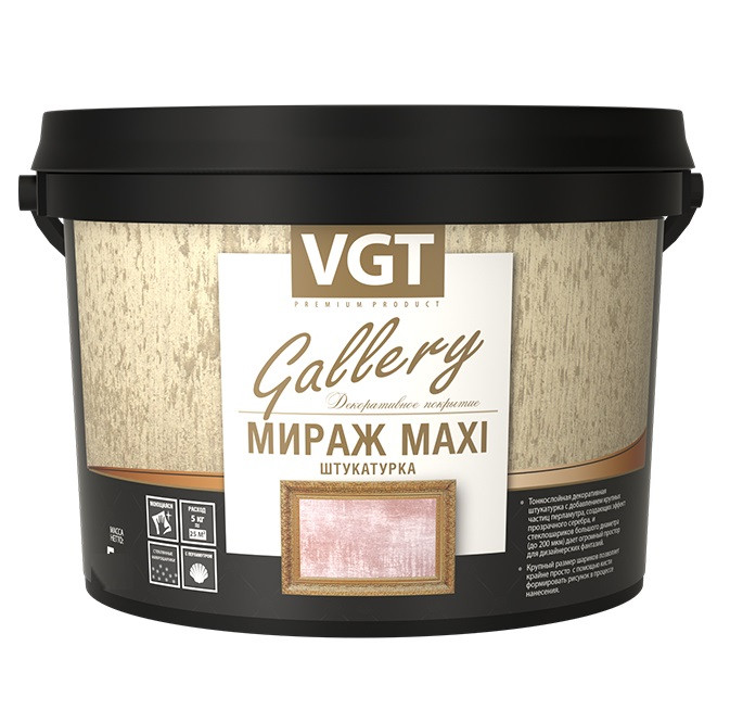 Штукатурка декоративная VGT Мираж Maxi серебристо-белая база 0,8 л/1 кг тонкослойная декоративная штукатурка с добавлением крупных частиц перламутра, создающих эффект прозрачного серебра, и стеклошариков большого диаметра (до 200 мкм) дает огромный простор для дизайнерских фантазий. Крупный размер шариков позволяет крайне просто с помощью кисти формировать рисунок в процессе нанесения.
