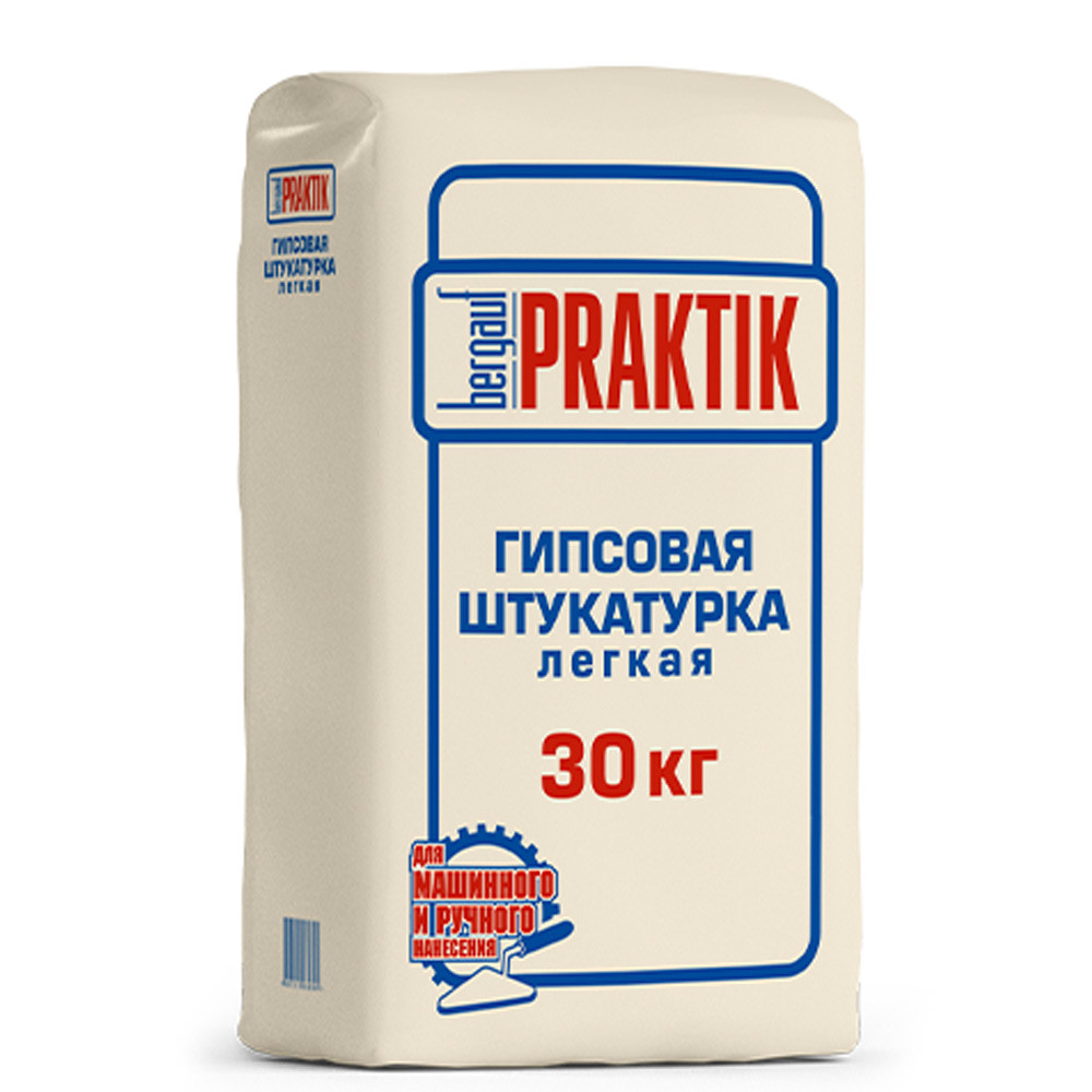 Штукатурка гипсовая Bergauf Praktik Легкая - штукатурка с легким наполнителем для выравнивания стен и потолков с целью последующего финишного шпаклевания, покраски или нанесения декоративных штукатурок. Применяется для работ по кирпичной кладке, бетону (старше 6 месяцев), железобетону, газобетону, старым цементным и цементно-песчаным штукатуркам, а также по гипсокартону и гипсосодержащим поверхностям. Для работ в помещениях с нормальным уровнем влажности.