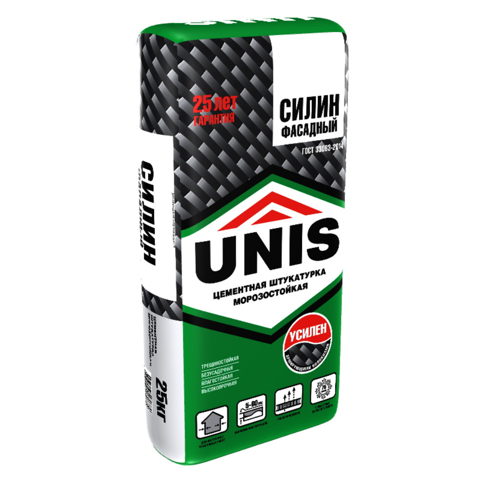 Штукатурка цементная Unis Силин фасадная 25 кг применяется для выравнивания ручным и машинным способом поверхностей фасадов зданий и сооружений выше цокольной части без штукатурной сетки слоем до 30 мм, ремонта сколов, выбоин, раковин, трещин до 60 мм.
