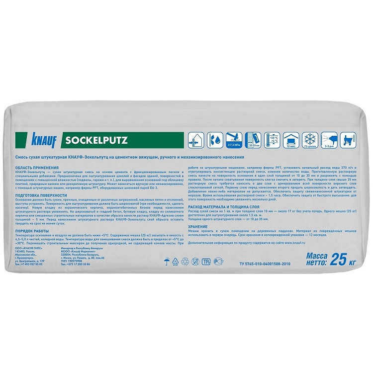 Цементная цокольная штукатурка Knauf Зокельпутц - это сухая штукатурная смесь на основе цемента с фракционированным песком и специальными добавками, обладающая повышенной прочностью. Применяется как для внутренних, так и для наружных работ.