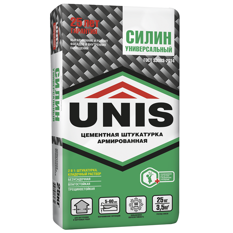 Цементная штукатурка Unis Силин армированная предназначена для выравнивания фасадов, применения внутри помещений при оштукатуривании стен и потолков слоем до 30 мм (без штукатурной сетки), для ремонта сколов, выбоин, раковин, трещин глубиной до 60 мм, заполнения стыков ЖБИ.