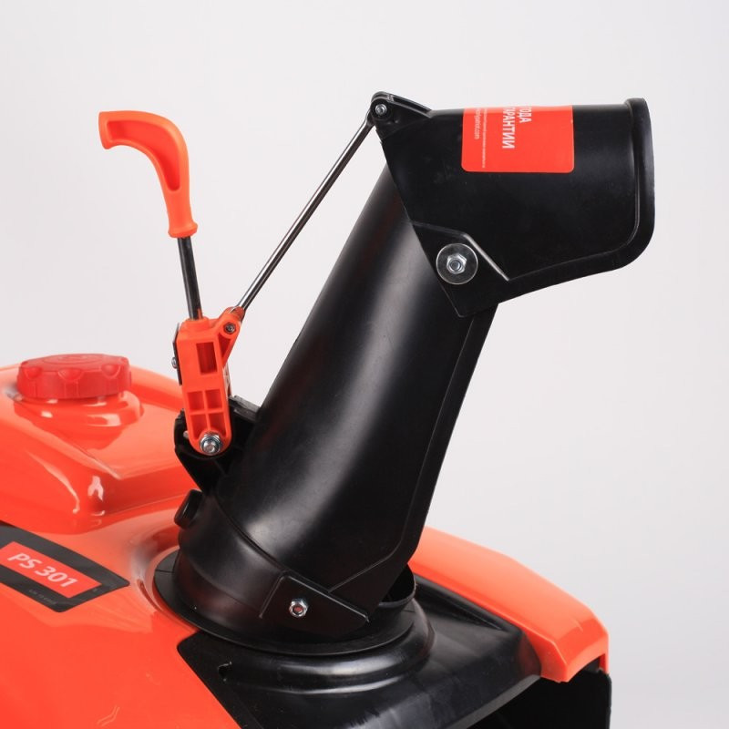 У модели PS 301 желоб для выброса снега можно поворачивать вручную на 180 градусов. Рукоятка для поворота находится на ручке и соединена с желобом стальным тросиком.
