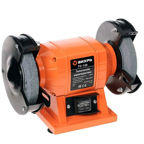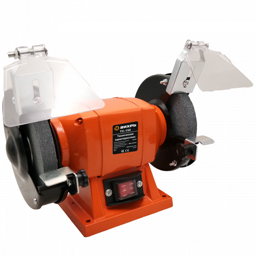 Станок точильный Вихрь ТС-150 относится к типу универсальных лёгких заточных станков с приводом от электромотора и является низковольтным оборудованием. Точильный станок предназначен для заточки ножей, стамесок и другого режущего инструмента. Машина состоит из алюминиевого корпуса, в котором расположен асинхронный электродвигатель. На валу ротора двигателя крепятся шлифовальные круги. Для безопасности на корпусе машины смонтированы защитные кожухи с искрогасителем, прозрачным экраном и рабочим упором. Точильный станок компактный инструмент.
