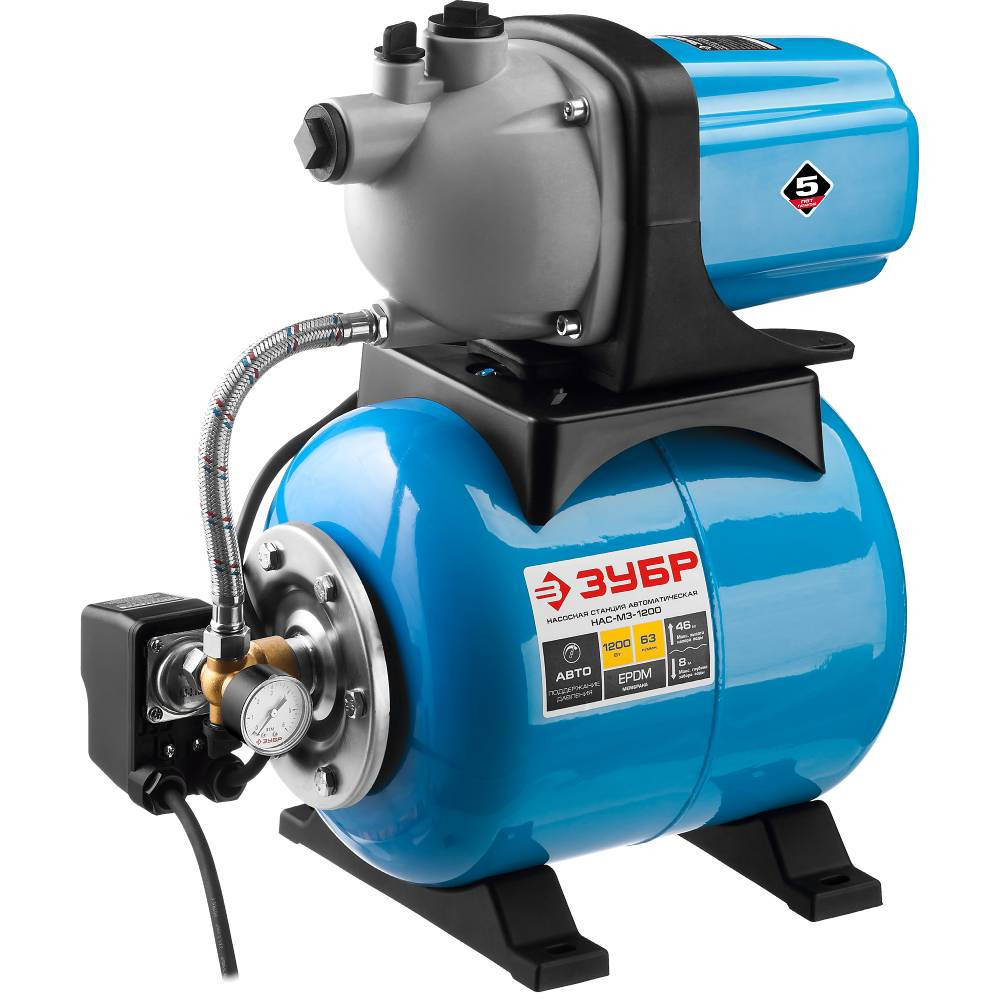 Станция насосная Зубр Мастер НАС-М3-1200-простая в применении установка, предназначенная для забора воды с глубины, полива, автоматического поддержания давления при устройстве систем водоснабжения, а термопредохранитель для защиты двигателя и экономичность благодаря гидроаккумулятору делают ее незаменимой на дачном участке.