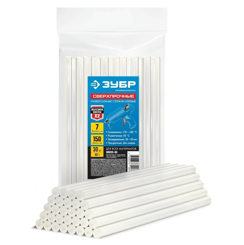Стержни клеевые прозрачные сверхпрочные Зубр Профессионал 06855-30 7х150 мм 30 шт