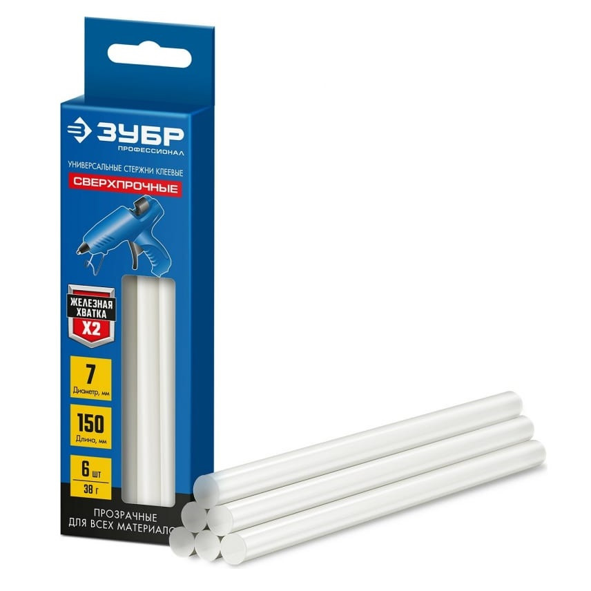 Стержни клеевые прозрачные сверхпрочные Зубр Профессионал 06855-6 7х150 мм 6 шт универсальные клеевые стержни со специальным составом обеспечивающим надежное соединение после застывания.