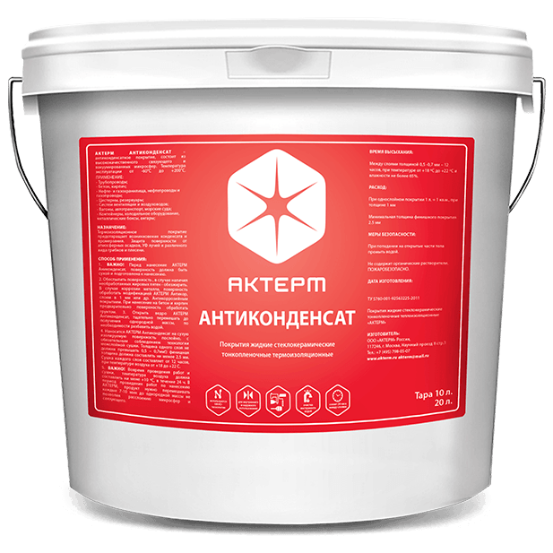 Актерм Антиконденсат – сверхтонкий жидкий термоизолирующий материал на водной дисперсии, предназначенный для предотвращения образования конденсата на металлических, бетонных, кирпичных и других видах поверхностей. Средство Актерм Антиконденсат не содержит органических растворителей и летучих соединений, является безопасным, нетоксичным, благодаря чему пригодно для применения как снаружи жилых и производственных помещений, так и внутри.