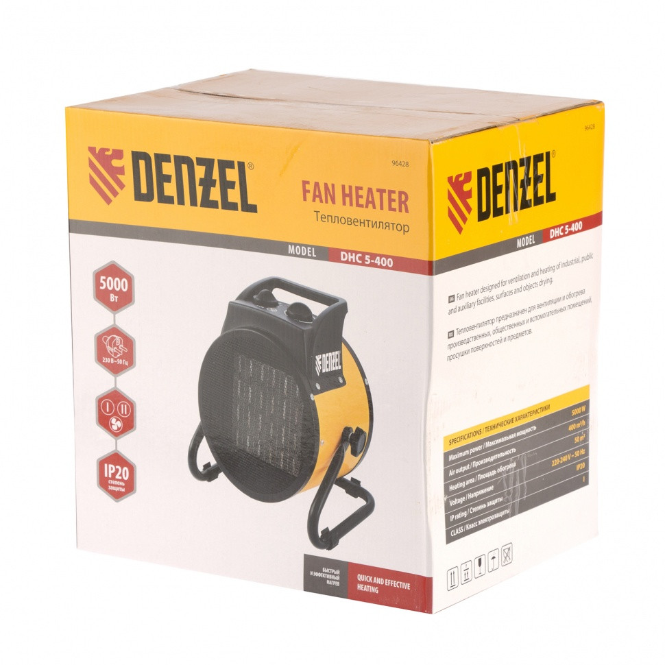 Тепловая пушка Denzel DHC 5-400 96428 справляется с обогревом складских, бытовых и подсобных помещений площадью до 50 м2. С ее помощью можно просушивать поверхности на строительной площадке (окрашенные стены, стяжки). Также ее можно использовать как вентилятор для проветривания комнат. Пушка работает от однофазной сети 230В, поэтому подходит для бытового применения.