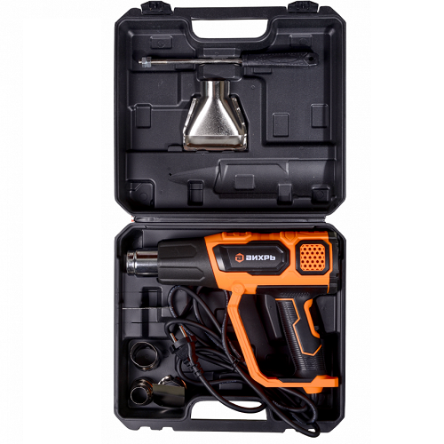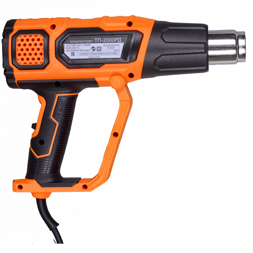 Термопистолет Вихрь ТП-2000РД – ручной электроинструмент для обработки горячим воздухом поверхностей и материалов, для удаления красок, формования и сварки пластмассы, нагревания термоусадочных труб; инструмент также подходит для пайки и лужения, размягчения клеевых соединений (швов), а также размораживания водопроводных труб. Термопистолет предназначен для эксплуатации при температуре окружающей среды от -10°С до +40°С, относительной влажности воздуха не более 80% и отсутствии прямого воздействия атмосферных осадков и чрезмерной запылённости воздуха. Термопистолеты применяются для пайки с использованием припоев на основе олова и серебра; формования, либо сварки изделий из ПВХ, полистирола, акрилового пластика, плексигласа; быстрой сушки краски, заливочных масс, клеев; удаления облицовки, ковровых покрытий, обоев, герметиков, лакокрасочных покрытий; размораживания водопроводов, двигателей, холодильников, морозильников с использованием оснастки.
