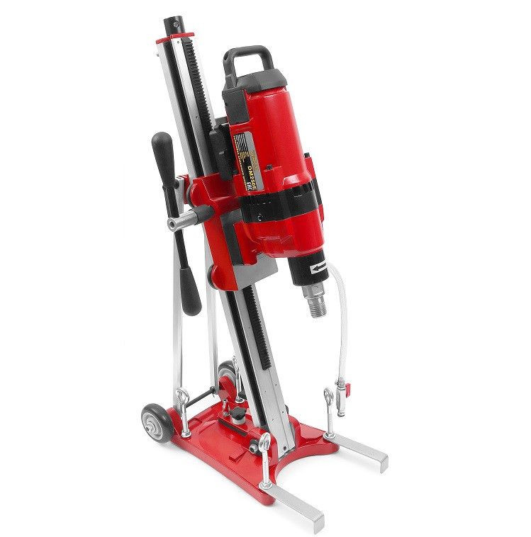 Комплектуется надежной стойкой с фунцкией наклона, что позволяет производить бурение под углом. В опорную платформу встроена система ваккумного крепления установки, позволяющая закрепить ее на ровной и гладкой поверхности. Для работы вакуумной системы необходимо подключение вакуумного насоса. Также сохранена возможность классического крепления установки с помощью анкерных болтов.