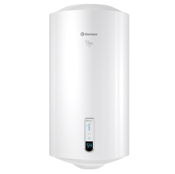 Водонагреватель электрический накопительный Thermex Hope 100 V ЭдЭБ04857 это электрический водонагреватель накопительного типа, выполненный в компактном круглом корпусе белого цвета. Он оснащен трубчатым нагревательным элементом, магниевым анодом и внутренним баком из биостеклофарфора. Спереди на корпусе находится электронная панель управления и небольшой дисплей.