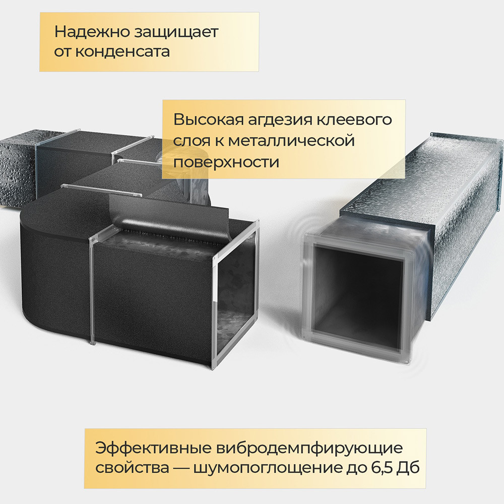 - Надежно защищает воздуховоды систем вентиляции и кондиционирования от конденсата и тепловых потерь, является эффективным шумопоглощающим и вибродемпфирующим материалом.